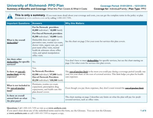 PPO The Summary of Benefits and Coverage SBC document will help you choose a health plan. Anthem Blue Cross PPO hospital or residential treatment center waived for emergency admission. You must pay all of the costs for these services up to the specific deductible amount before this plan begins to pay for these services.