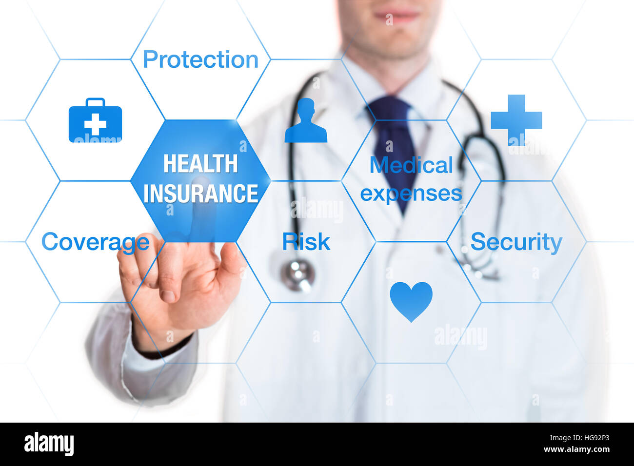 Health Insurance Concept With Words Coverage Protection Risk And Security On A Virtual Screen And A Medical Doctor Touching A Button Stock Photo Alamy
